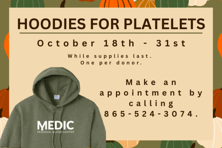 Platelet donors receive a hoodie when they donate between October 18th and 31st. This promotion is valid for platelet donors only.